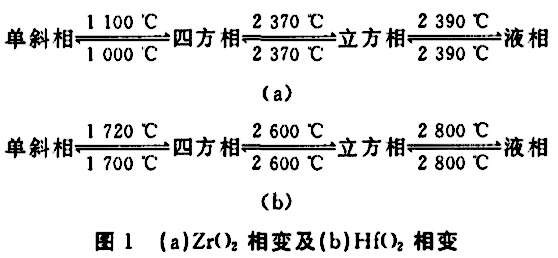 關(guān)于相變?cè)鲰g的研究主要是圍繞ZrO2的相變特性展開的,是通過控制燒結(jié)工藝使內(nèi)部的微觀組織產(chǎn)生增韌相,消耗裂紋擴(kuò)展所需能量的同時(shí)造成相變體積膨脹促使其它裂紋閉合,是一種自增韌過程。以ZrO2和HfO2為例,隨溫度變化會(huì)發(fā)生以下同素異構(gòu)轉(zhuǎn)變: